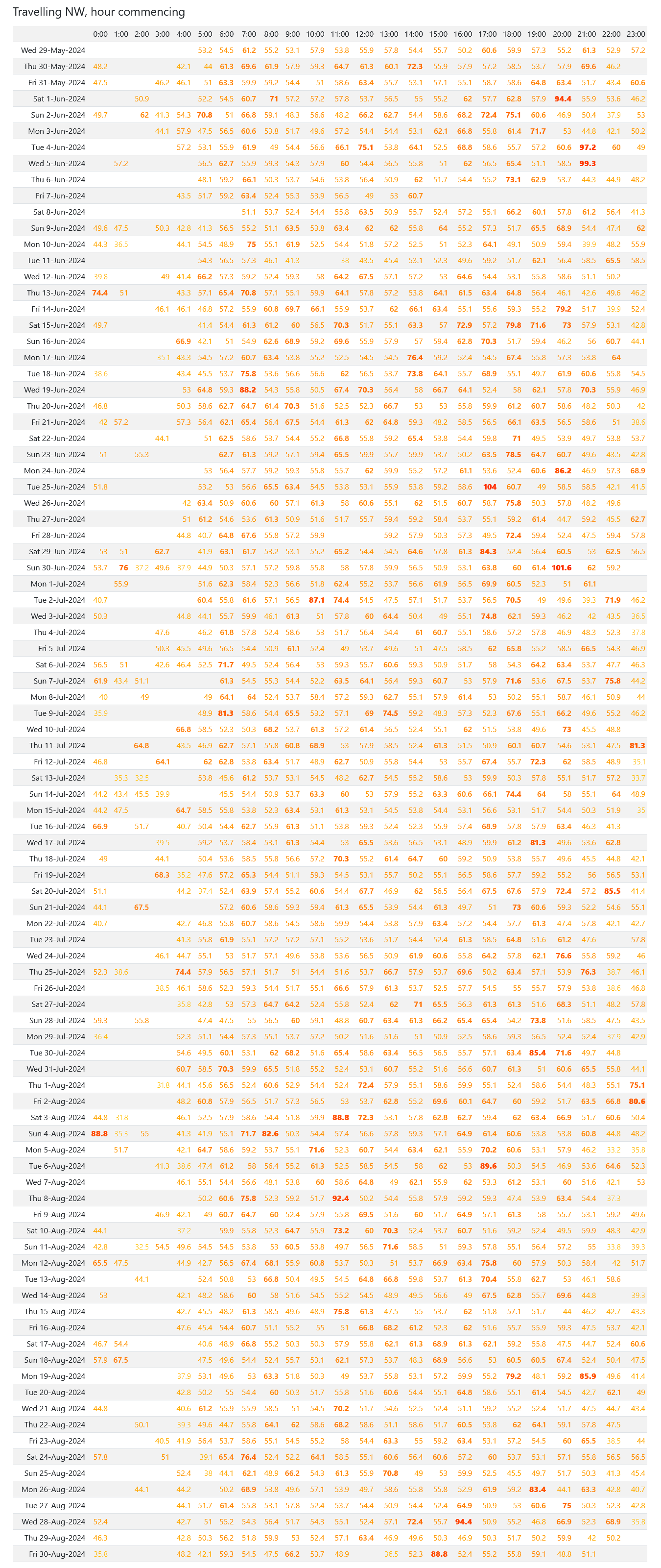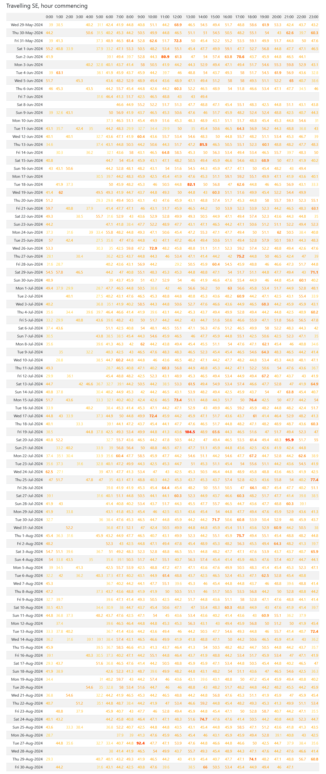 A 'heatmapped' summary of max speeds per day, by hour slot. This page aggregates a lot of data, and was taking forever to load; so I took screen shots and these are the images. Result, fast loading!